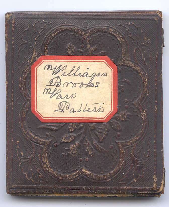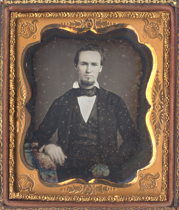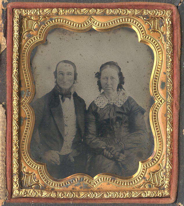 Sixth-plate daguerreotype of a handsome young man. He is identified on the back as William Brooks Van Patten; his middle name taken from his mother’s family name. Accompanying this image is a sixth-plate ambrotype of his parents, Jacob Van Patten and Frances Brooks Van Patten. Jacob was born in Cobleskill, New York and died in Fort Wayne IN. He was married to Mary E Stickles and they had five children. Jacob worked as a machinist. A slender gentleman, Jacob is dressed in a traditional black suit and sports a goatee. You can see the resemblance to his father. The daguerreotype has great tones and contrast with some light tint to his face. It has some scattered spots as seen. Some of these might rinse off with a professional distilled water rinse. The ambrotype has some spotting as seen. Jacobs’s parents were farmers and are starting to show their age from working the land. Both are housed in half case with the identifications attached on the back of the case on a label in ink.