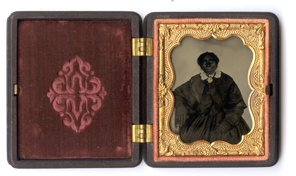 Striking ninth-plate ambrotype of an elegant African American woman. She is dressed in a gorgeous black gown with a matching dark cape, bow and lace gloves. A gold-gilded cameo pin is seen attached to the ribbon to accentuate her white lace collar. She also wears a simple small white bonnet. She is posed perfectly but under close examination her eyes seem quite sad or possibly just tired. The ambrotype is in excellent condition with beautiful tones and contrast. The plate is as best as you will find and still has its original blackened tin backing. It is housed in an equally beautiful brown geometric union case, Berg 3-288. There are a couple of fleabites on two of the rounded corners.