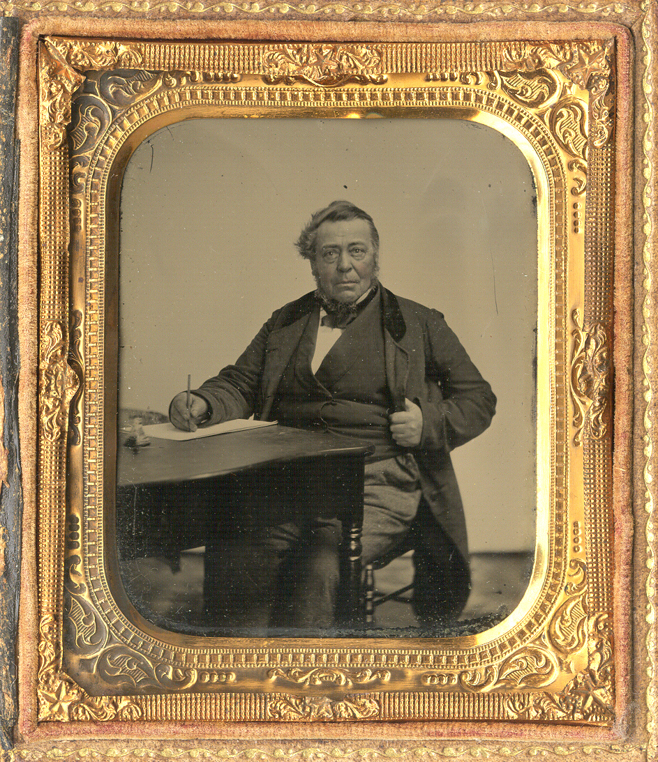 Strong sixth-plate amber glass ambrotype of a writer. Seen at his large desk putting pen to paper, he is perfectly posed. There’s an element of surprise in his appearance but also a sense of distraction from being disturbed. He seems to be a focused gentleman full of confidence as his hand grabs his jacket in a power move. This sharp image is in very good plus condition with great tones and contrast. There is some light hand tinting to the writer’s face and there are some wear/light mat marks as seen. The image is housed in half of a case.