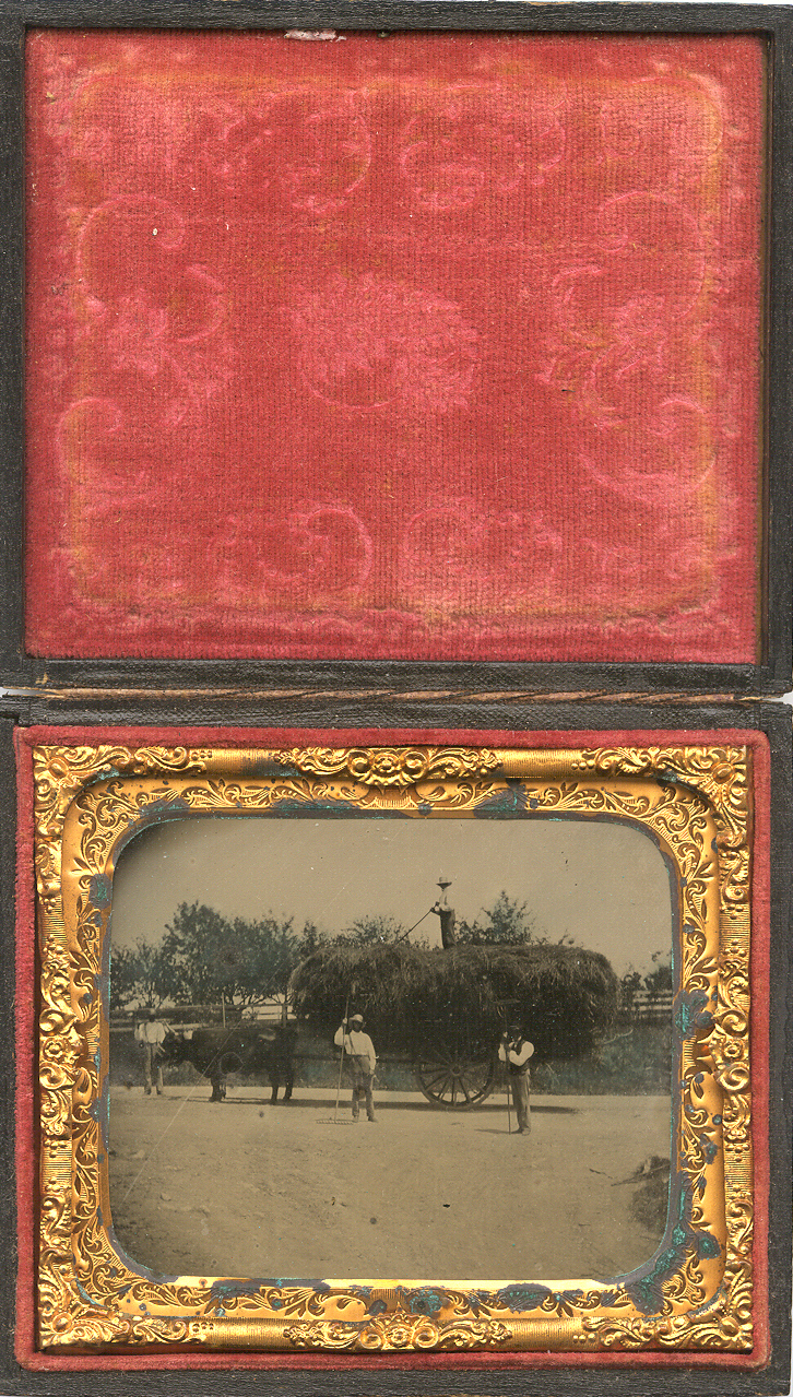 Superb sixth-plate outdoor occupational ambrotype of four farmers moving an extremely large wagon stacked high with hay. One man stands steadily atop the large mound of hay skillfully arranged to achieve the maximum load. A fall from that height would certainly not be pleasant! Two other men stand in front of the crop with rakes in hand. Another man stands to the far left to steady the large black ox that is pulling the wagon. It is difficult to tell because of the shadows but this man could be African American. We speculate that a traveling photographer happened on to this ordinary workday and either sold them an image or captured rural farming life for a display of his talents in his traveling studio. This is a fantastic outdoor working occupational that is not often seen. The image is in very good condition with nice tones and contrast. There is also some greenish tinting to the trees and ground as seen. There is one extremely light line mostly noticed only at an angle in the area of the ox and this might be original to the collodion. The image is housed in a full case.