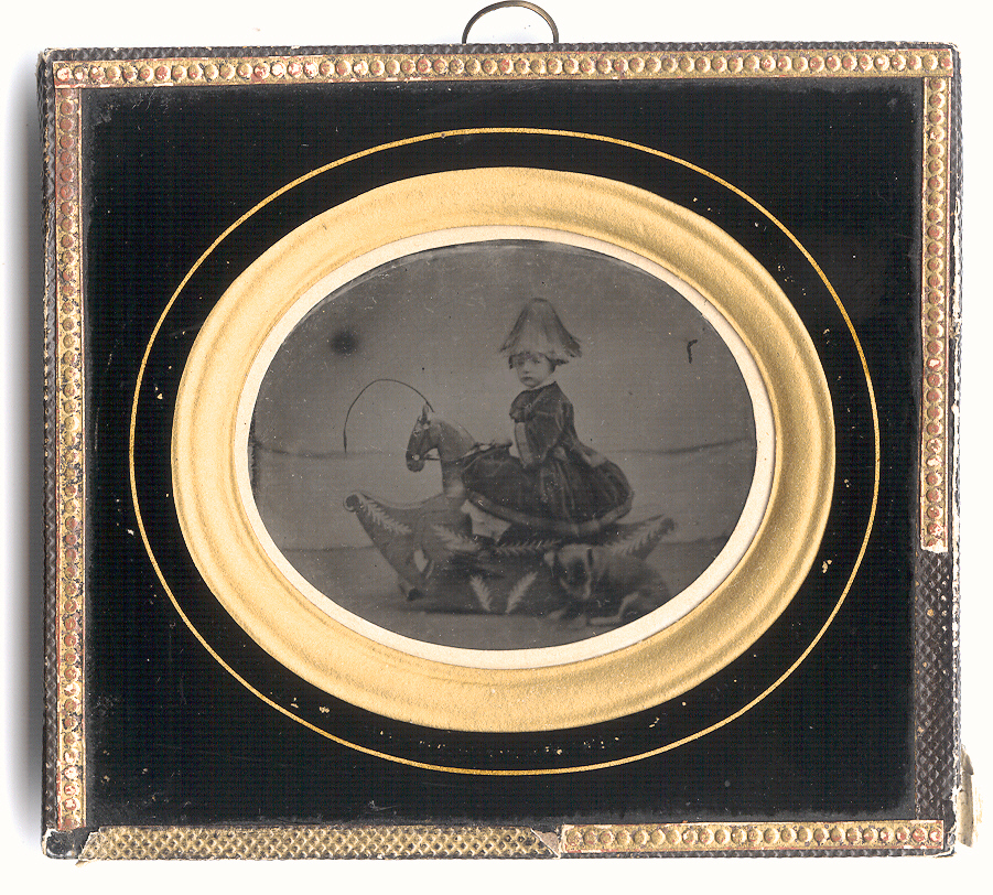 Extraordinary French ninth-plate ambrotype of a young boy wearing a military style hat and posed on one of the coolest carved and decorated rocking horses that we have seen. Wearing a luxurious velvet dress, he stares at the photographer while he holds onto the saddle horn with his whip arching in front of the horse’s head. His small dog tries to stay awake as its head droops toward the floor on the bottom right side. Could this possibly be Prince Louis Napoleon? At the very least it is a child from wealth or royalty. The image is in very good plus condition with nice tones and contrast. The horizontal line seen in the background is part of the drape in the back. There is spot on the left top and a tiny dark line on the top right. The image had the original back still intact and we have opened it to clean the glass and put an archival black paper behind the plate. The passe-partout presentation has some of the decorative border seal missing as seen. This image will bring you great joy!
