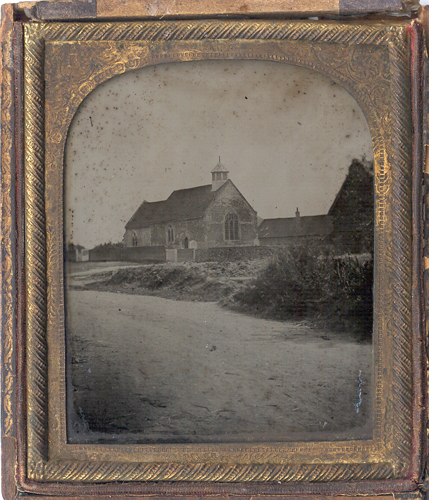 Serene sixth-plate English outdoor ambrotype of an old stone church in the countryside or on the edge of a town. A rectory or school is visible in the background. The image has nice contrast and tones with some spotting as seen. It is housed in half of a damaged case that has seen better days.