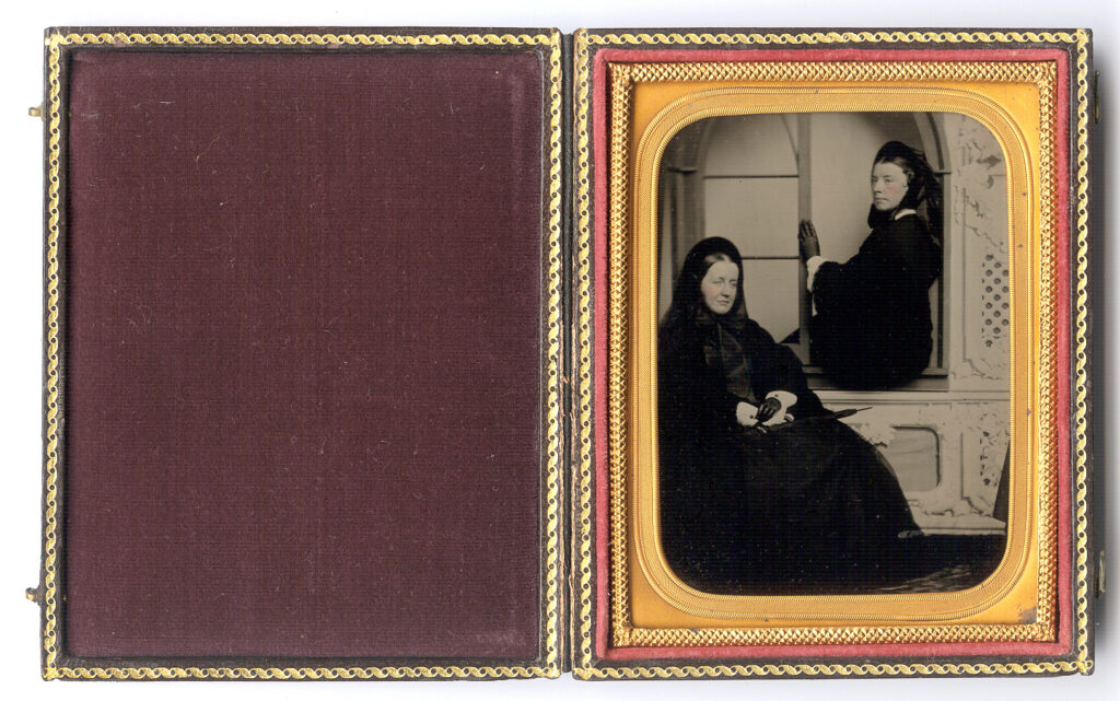 Breathtaking quarter-plate ambrotype of a mother and daughter in one of the more artistic poses you will find. Judging from their outfits this could be a mourning portrait. Both are wearing elegant black dresses, black leather gloves and black hats with black ribbons tied around their necks. Mom is placed seated on the left holding her umbrella while her daughter sits in a highly decorative window opening on the right. The photographer is not identified, but this is surely a high-end studio considering the professional nature of the setting. The image has the markings of a mourning piece as the mother has a contemplative look on her face. The daughter looks more serious with her hand grabbing the window for support. This stunning piece is in excellent condition with great tones and contrast with light tint to their faces and lips. It is housed in a very nice full case with a great plain purple velvet pad.