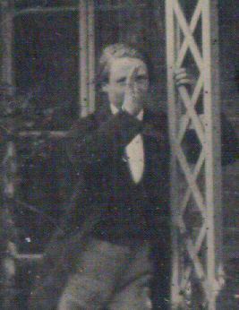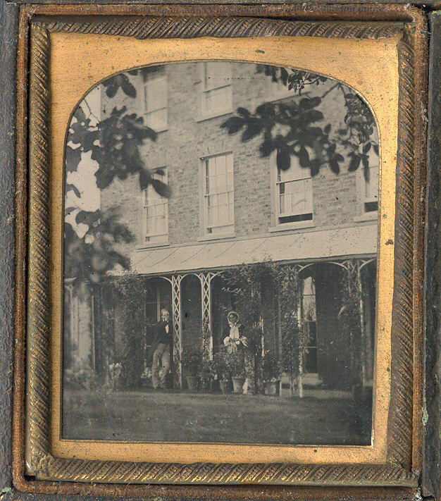 Charming sixth-plate English outdoor ambrotype of a mother and son posed outside their large home which is adorned with a row of potted plants in front of the woman. The young lad raises his hand in front of his face with a wave or possibly a Bronx cheer! With him having so much fun we wonder if his father or a friend was the photographer or possibly this was a self-portrait. We love the way this image is framed with the moving branches creating a lovely effect on the top. The plate has nice tones and contrast and at an angle we can see some crackling in the black backing. It is housed in a half case that has a lot of wear.