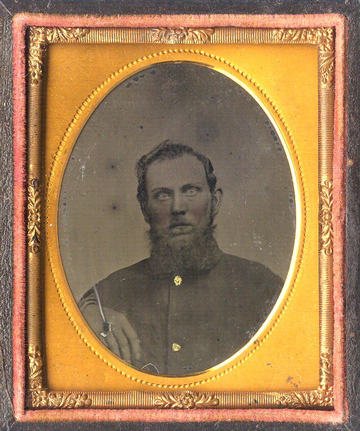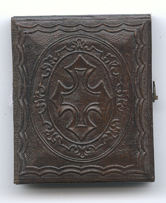Great ninth-plate tintype of a Civil War soldier who appears to be wearing a four-button sack coat. His stare is intimating and scary. We wouldn’t want to be in close battle with this guy, and we suspect he has seen a few already. The image is in very good condition with nice tones and contrast and some wear as seen. It is housed in a great full case with a cross style design.