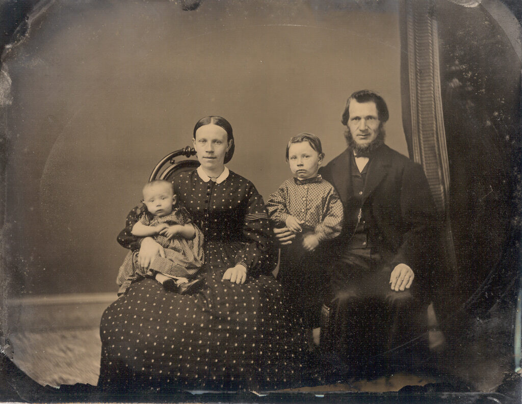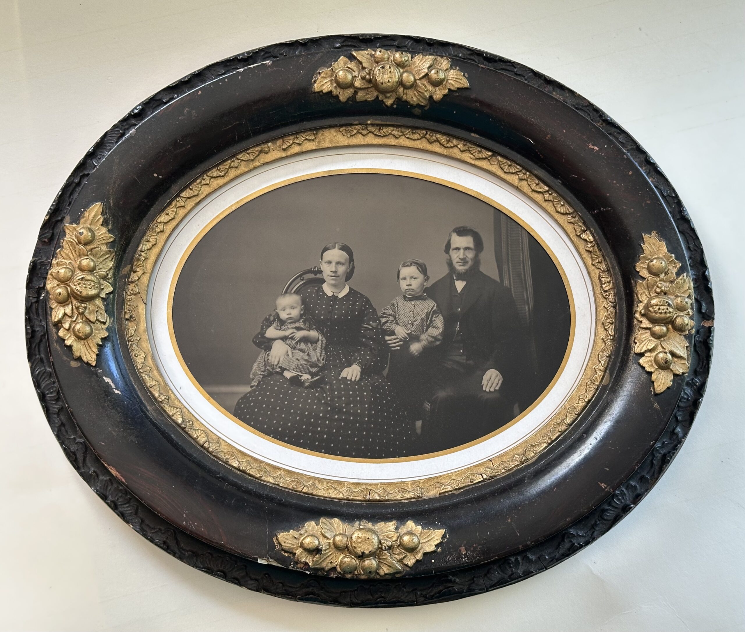 Striking whole-plate tintype of a family in its original wood and gilded frame. We see a young husband and wife posed with their cute boy and baby. Dad is dressed in a traditional dark suit while mom wears a lovely black polka-dot dress with a simple white collar with a pin attached. The perfectly posed young boy has a wonderful facial expression that seems to judge the photographer’s technique. He stayed in perfect focus except for his one hand moving from anxiety or possibly having to go to the bathroom! The little one seems quite unfazed by the process as he or she snuggles in mom’s protective grasp. Both kids are in cool polka-dot outfits to match their mother. The image is as beautiful as you will find. The tones and contrast are exceptional. The white mat has the usual toning and spots from all the years. The frame is in very nice condition with a little loss that would be easy enough to repair if desired. This came to us from an older Arizona collection.