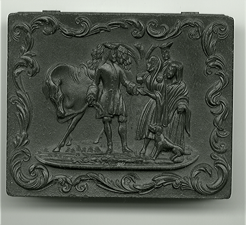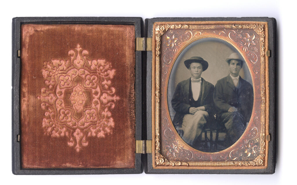 Fascinating quarter-plate tintype of two cool dudes in hats. The young man on the left has a glimmer in his eyes as if he has been looking forward to their day in the studio. We can’t say for certain but under close examination he might be mixed race. He wears a working man’s suit but adds some pizazz with his light checkered pants. His buddy seems a little less enthusiastic and appears to lean out of the image on the right! The image is in very good minus condition with just a hint of tint. There is a brush mark on the man on the right and there is some loss under that mat that seems stable. It is housed in a well-worn union case, “Roger deCoverly and the Gypsies Fortune 2”, Berg 1-38. The case also has a warp and doesn’t latch properly.