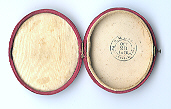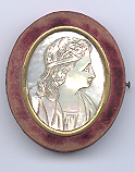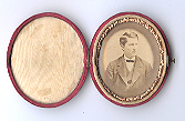 Cool oval velvet case with a mother of pearl cameo with a Grecian or Roman theme and housing an albumen photo of a handsome young man….(more)