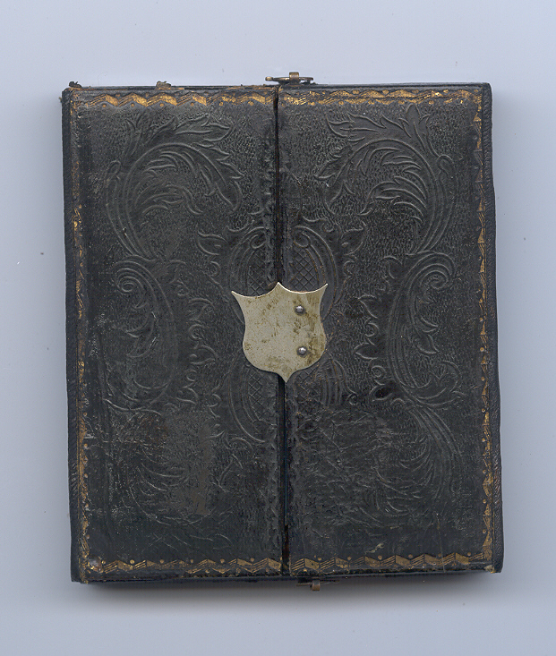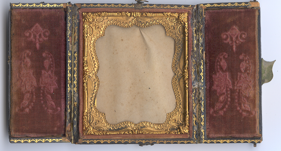 Scarce double-door case with a union shield on the front. The case has wear as seen but it will still display an image quite nicely. This one has both eyelets and the clasp intact and it has a glass brass mat and preserver inside waiting for that perfect image.