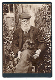 Exceptional cabinet card of an older gentleman lovingly gazing at his black cat as it sits on his lap..(more)
