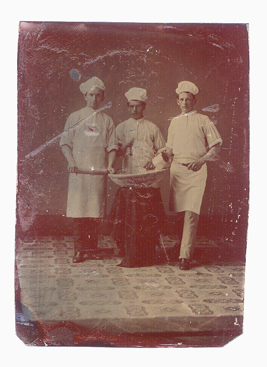 Occupational CDV tintype of three young bakers. The man on the left holds a rolling pin while the man on the right is pouring a can of flour while holding a whisk. The man in the center is stirring the mixture in a large bowl. The image is darker in tones with a brown hue. We have lightened the scan to show the detail. There is quite a bit of wear/scratches as seen with the varnish layer poorly applied.