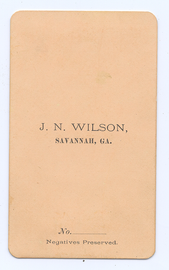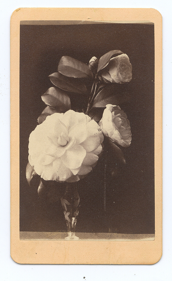 Gorgeous still life CDV showcasing an arrangement of camellias, the floral symbol of the South. The small hand painted or etched vase in an interesting selection as these large lovely flowers dominate the photo. The image is in excellent minus condition with deep rich tones and stark contrast. The lighter line on the bottom is part of the original negative or process. There is a pinprick mark at the edge of the mount. By J.N. Wilson, Savannah, GA.