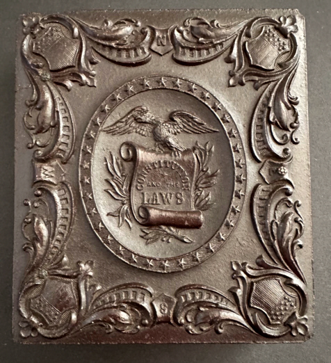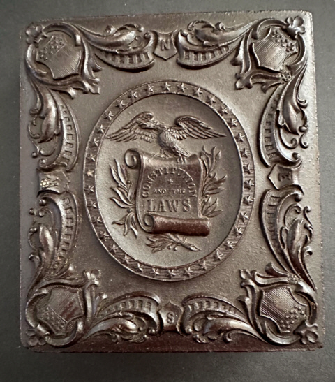 Shiny sixth-plate union case “Constitution and the Laws”, Berg 1-56. This brown case has a high gloss with some rounded or nicked corners as seen. There is a little roughness on the top rail and a small hairline by one corner. There is no image, mat or preserver but this one is perfect for that special Civil War soldier or patriotic themed daguerreotype! We see this design more in the ninth-plate size so don’t miss on this larger size.