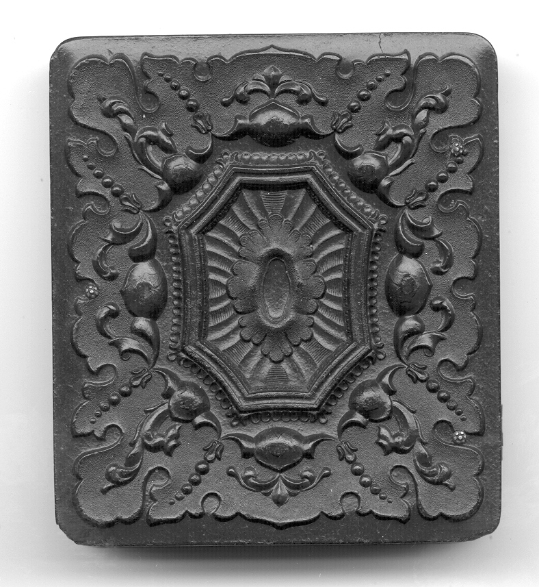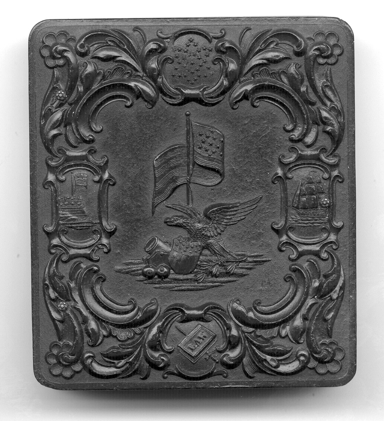 Patriotic sixth-plate union case, “Eagle and Flag”, Berg 1-55 on the front cover. The back has a geometric design. The case is black in color with a nice gloss and beautiful relief. There are a couple of extremely small flea bites and one small hairline crack on the top back rail. The bottom and top rail of the back of the case show a hint of a slight warp but this is hardly noticed and it closes perfectly. There is no image or mat or preserver but this is a perfect case for that special Civil War soldier.