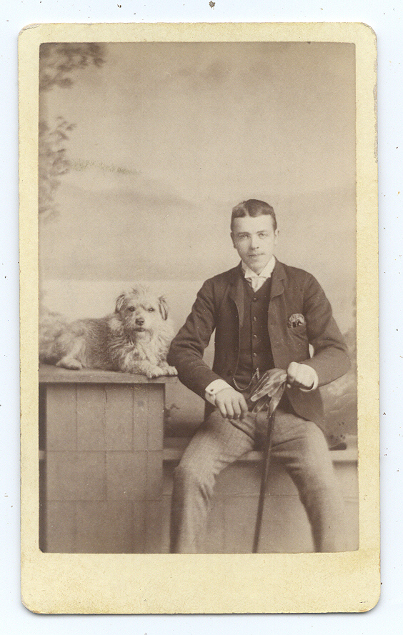 Charming CDV of a dapper young man posed with his adorable dog. He is quite the looker with his walking stick and gloves and what appears to be a tufted or quilted pocket square. His best friend is the ideal subject and holds his pose perfectly. The image is in excellent minus condition with great tones and contrast. By G.H. Pyne Jones, Sunderland.