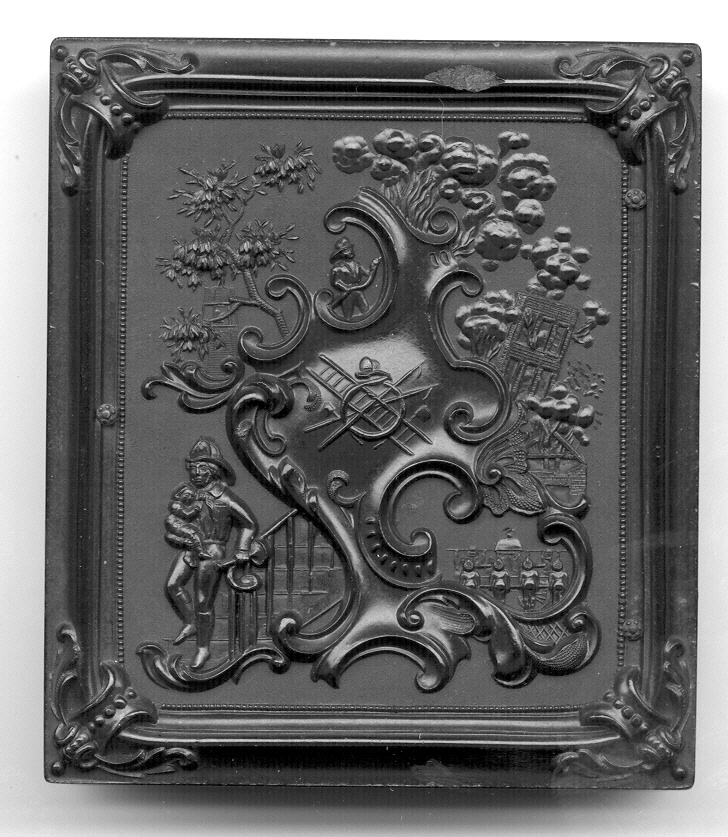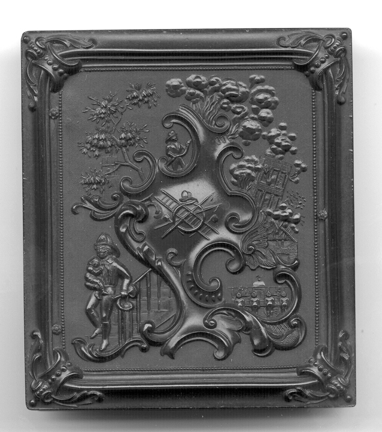 Gorgeous sixth-plate union case, “Fireman Saving Child 1”, Berg 1-96. The case is black and with a high gloss – this one looks new except for one chip on the back border as seen. There is no image but there is a mat, glass and preserver. If you have a special fireman image this one is perfect for its presentation.