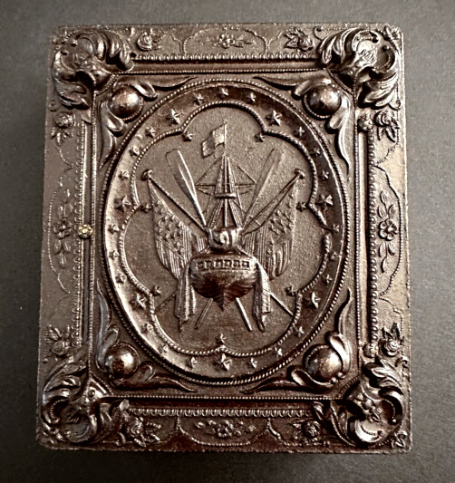 Scarce ninth-plate union case, “Ship’s Stern”, Berg 1-133. Brown in color with a strong patriotic relief and a little wear on the corner as seen. It has a tintype of an attractive young woman with tinted flowers and column seen on the right side. She is identified behind the case but the writing is hard to decipher.