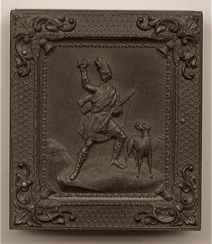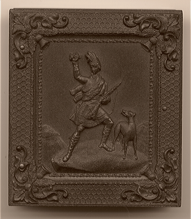Rare sixth-plate union case, “Highland Chief”, Berg 1-108. This case is brown in color with a decent gloss and in very good condition. Under close examination there is a little wear to the high relief, but the corners are sharp. There are a couple of extremely tiny flea bites with a very light line at the clasp. Inside is an ambrotype of a wild-haired gentleman with a slightly angry look on his face.