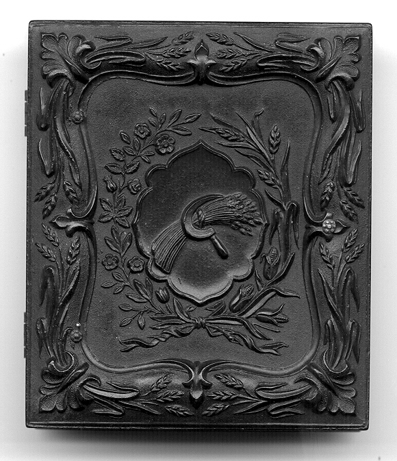 Beautiful ninth-plate union case, Scythe Cutting Grain”, Berg 1-149. Black with a high gloss, this is one of the nicest examples you’ll find. A couple of extremely tiny fleabites on the back inside rail with a light line at the clasp. No image, mat or preserver.