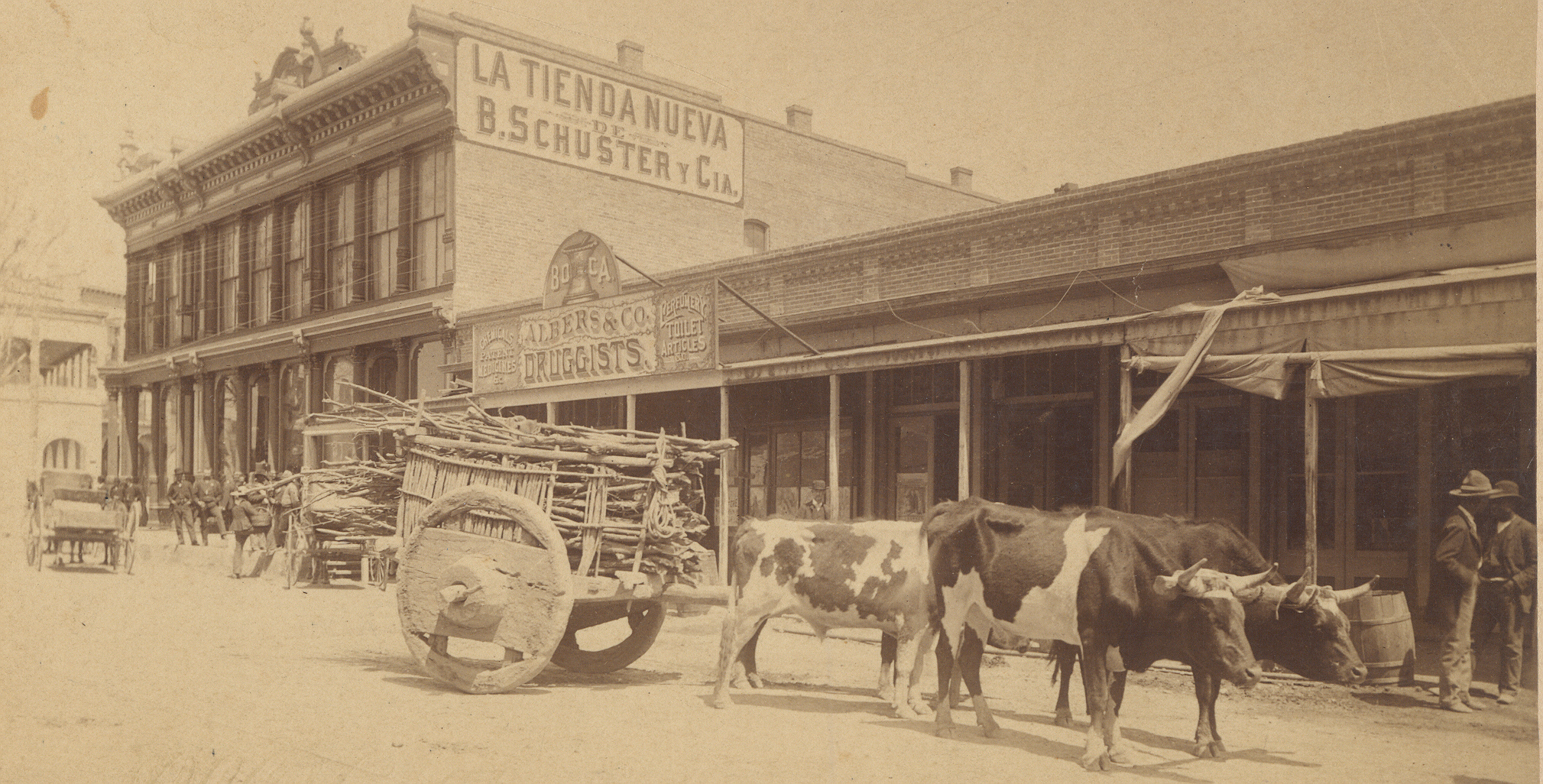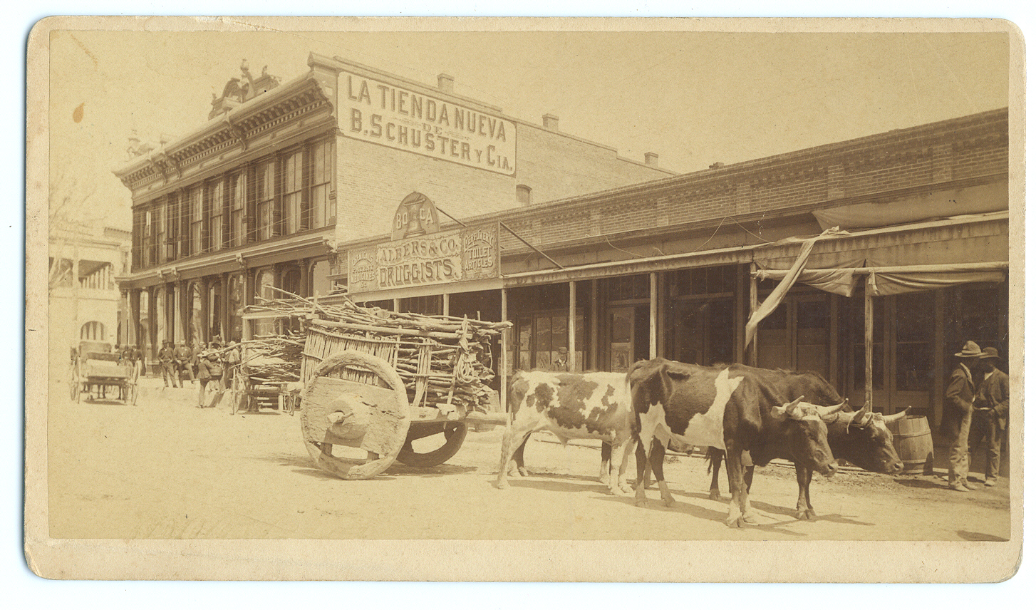 Amazing cabinet card of an early El Paso, Texas street scene. Front and center we see an astonishing early wooden-wheeled oxen cart hauling a load of wood limbs and branches. Off to the right we see men next to the boardwalk talking and they appear to be men of color. The first sign we see reads La Tienda Nueva de B. Schuster y Cia, which translates to The New B. Schuster and Company Store. Directly below is Alberts & Co., Druggists. Their sign reads Perfumery Toilet Articles Co. on the right side and Chemicals, Patent Medicines on the left. There is a large mortar and pestle at the top center with the letters BOCA. We found a listing for A.K. and E.N. Akers as druggists at 10 S. El Paso Street in an 1885 directory. The large structure in the background has numerous men in the street including what appears to be at least one African American gentleman. There is another cart just barely visible behind the oxen cart and possibly a food vendor as we see a man in a Sombrero-Cordobes-type hat reaching into his basket.
