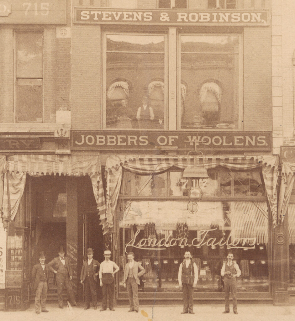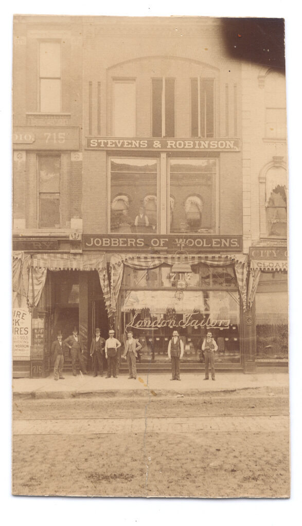 interesting cut boudoir cabinet card showing the photographic studio of Stevens and Robinson. If you look on the bottom left by the doorway you will see a photo case with numerous cabinet cards on display. The sign on the opposite side reads “Stevens and Robinson.” There is a man and woman in the windows of the studio on the second floor. On the left of the window is the “715”address and what appears to be the partial letters of studio, “DIO.” The former owner thought this might be Trenton, MO because of other photos they had purchased together with this one, but we have found no evidence of this photographic studio in Missouri. Below the studio is a London Tailors shop with Jobbers of Woolens directly above. While there is partial signage, unfortunately nothing has helped in identifying the location. Interestingly, above the “City” sign on the right it reads Shampooing so possibly a bath house. The image has nice tones and contrast. There is a wrinkle along the center of the image more prominent on the bottom.
