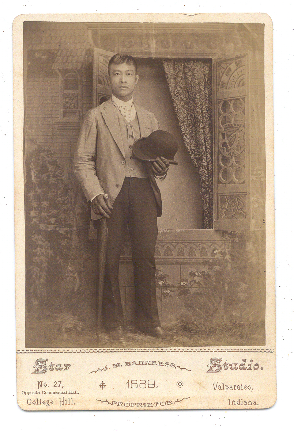 Unique cabinet card of a dapper Asian gentleman perfectly posed with his bowler hat and umbrella. He is identified on the back as “James Wong, Portland, Oreg.” Certainly no stranger to the camera, this image was captured in Valparaiso, IN and was most likely related to Valparaiso University, suggesting that Mr. Wong was a scholar. If anyone would have any information it would be appreciated. This engaging cabinet card is in very good condition with great tones and nice contrast. A little wear to the mount as seen. By J.M. Harkness, 1889, Star Studio, Valparaiso, Indiana.
