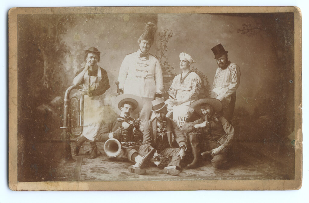 Comical advertising boudoir cabinet card of a clown band. Their costumes feel like precursors to the Village People. The clown in the sailor hat is wearing an advertising outfit that reads “Victor Roller Mills” which was located in Ottawa, IL. Possibly these guys worked at the factory and at the very least he made his outfit out of mill bags. We love the farmer on the bottom right as he chews on an old corncob. Now the clown right behind him holding the cymbal certainly has the look of a serial killer! This image will bring a daily smile to your face. It has great tones and contrast with quite a bit of wear as seen. By Gleim, Ottawa, ILL.