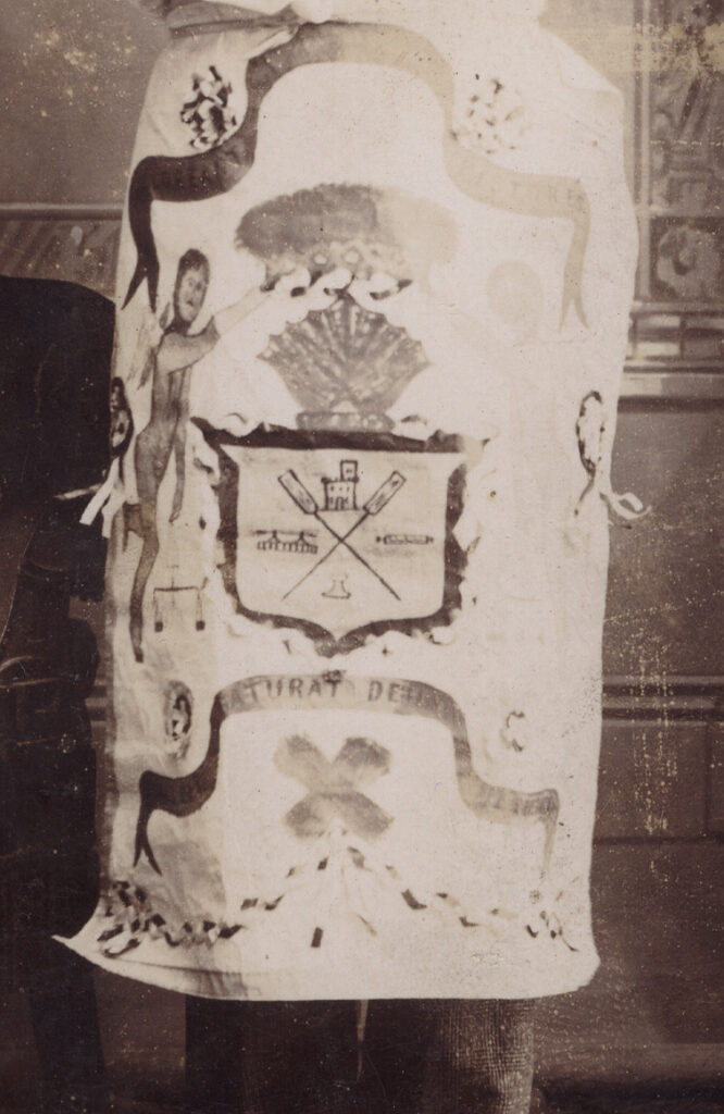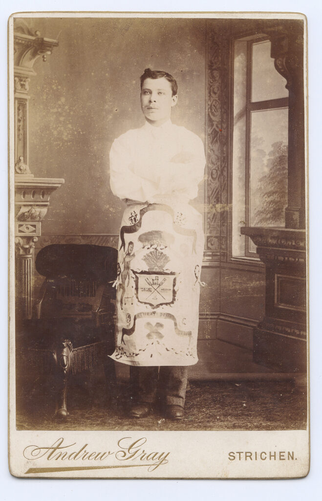 Dynamite Scottish cabinet card showing a man dressed in an elaborate Masonic looking apron. However, there is a written note on the back though that reads, Master Baker. According to one of our expert researchers this is probably associated with “The Scottish Bakers Association,” which was started in 1891. They did wear a Masonic style apron although we have not found this design in our search. On the apron, we see a winged creature reaching into what appears to be a raincloud. Below in the crest we see crossed oars, a castle, possibly two tents, what looks like a holiday cracker or a tied sausage link and another object. If anyone has any information please let us know. The image is in very good condition. The whites are extremely bright on his shirt.  By Andrew Gray, Strichen.