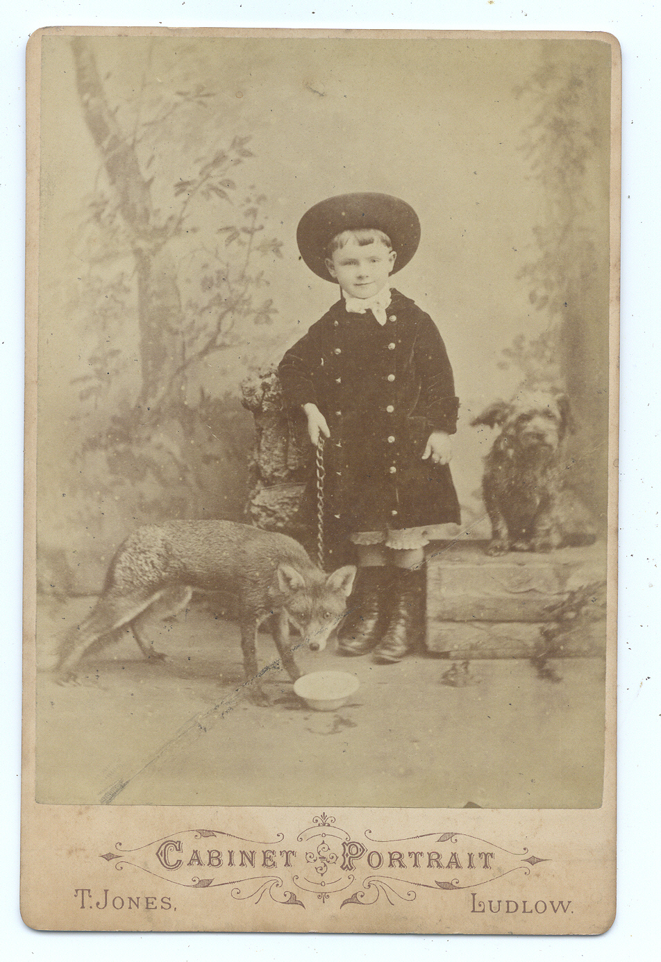 Humorous cabinet card of a young lad posed with his pet fox on a chain while his dog sits right next to him. We assume the fox was rescued as an abandoned pup but you can see the need for the leash as he intently stares at the photographer while looking up from his bowl! The boy is dressed in his Sunday best and has a nice smile. The image has decent tones and contrast but there is some wear as seen. By T. Jones, Ludlow.