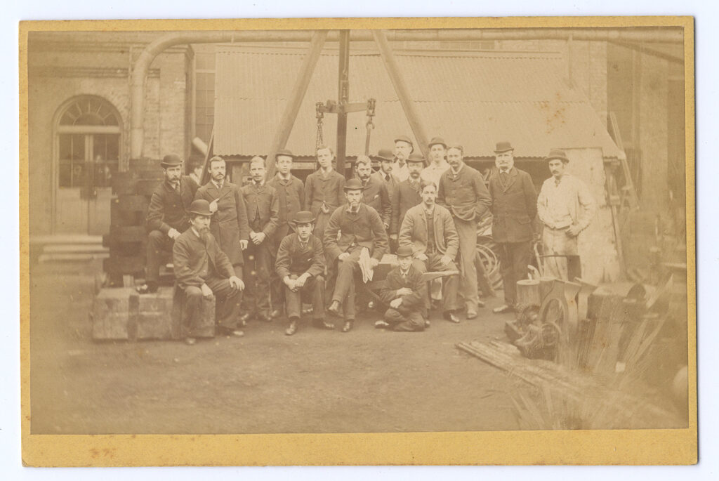 Interesting cabinet card cabinet showing the office staff of the engineers of the A. Ransome and Co., April 1881. A. Ransome & Co. was established in Chelsea, London, in 1868. They were an important firm which designed and manufactured woodworking along with timber-handling machinery and iron founders. In 1885 they were awarded a gold medal for the invention of cask-making machinery and a tree-felling machine. In the image, we see seventeen men and one younger lad outside the main building, along with some castings on the right and some type of lift behind them. Allen Ransome, the gentleman with the long beard, sits on the stones on the far left. The image is in very good condition with decent tones and contrast with some wear as seen. There is a photographer’s stamp on the back for The Graphoscopic Company of Charing Cross, London.