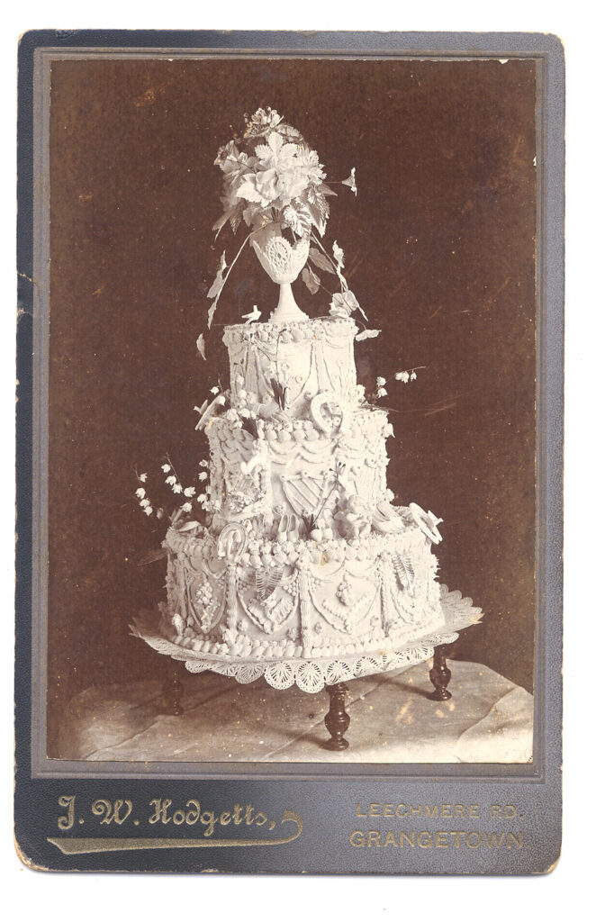 Intriguing cabinet card of a three tiered elaborately decorated cake. Possibly this was for a baking contest as the theme of the cake decoration is unclear, which actually makes it more entertaining. There are numerous horseshoes visible but if this was for luck they placed them facing downward – the wrong way! Along the top of the bottom tier we see four pair of women’s white shoes with a cherub in-between. We’re not sure if these are supposed to be ballerina slippers or just flats. The one element that is even stranger is the one arm sticking out on the top of the second tier on the left side. Maybe there is another hand on the other side but that doesn’t make it less weird. The cake has an “Alice in Wonderland” vibe! A cool possibly white chocolate vase is on top of the cake and contains fresh cut flowers. The piping and other decorative elements are amazing; this was a very time-consuming cake to construct even for an extremely talented person. The decorative bell-shaped flowers also add a nice touch. The image is in very good condition with nice tones and contrast. There is a small ding on the mount on the left and some wear on the corners as seen. By J.W. Hodgetts, Grangetown.