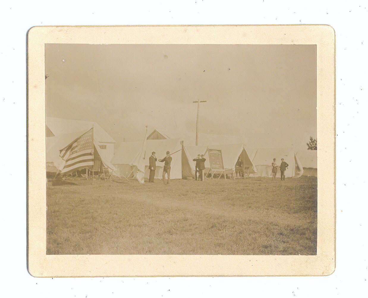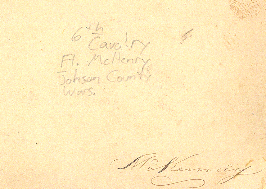 Interesting small format cabinet card (4’x5”) showing soldiers and tents at Ft. McKinney in Wyoming. There is a period ink identification on the back that reads McKinney but someone has written in pencil, 6th Calvary, Ft. McHenry, (wrong fort), Johson, (sic) County Wars. The Johnson County Wars was a range war, 1889-93, that involved wealthy cattle barons fighting with homesteaders and smaller ranches over water, land and cattle rights. Gunmen were hired by the Wyoming Stock Growers Association to eliminate their rivals, leading to US Army involvement. On the left side we see a large American flag flying with another possible regiment flag on the right. There is a soldier holding his rifle with attached bayonet over his shoulder. Two other soldiers, one smoking, are seen on their right with a large chalk board. While it might be possible to decipher we can’t quite read the writing on the board. An officer and another soldier are on the far right. There is a man in the tent behind them placing something on the officer’s desk. The image is in very good minus condition. The tones are slightly one note as seen with some wear.