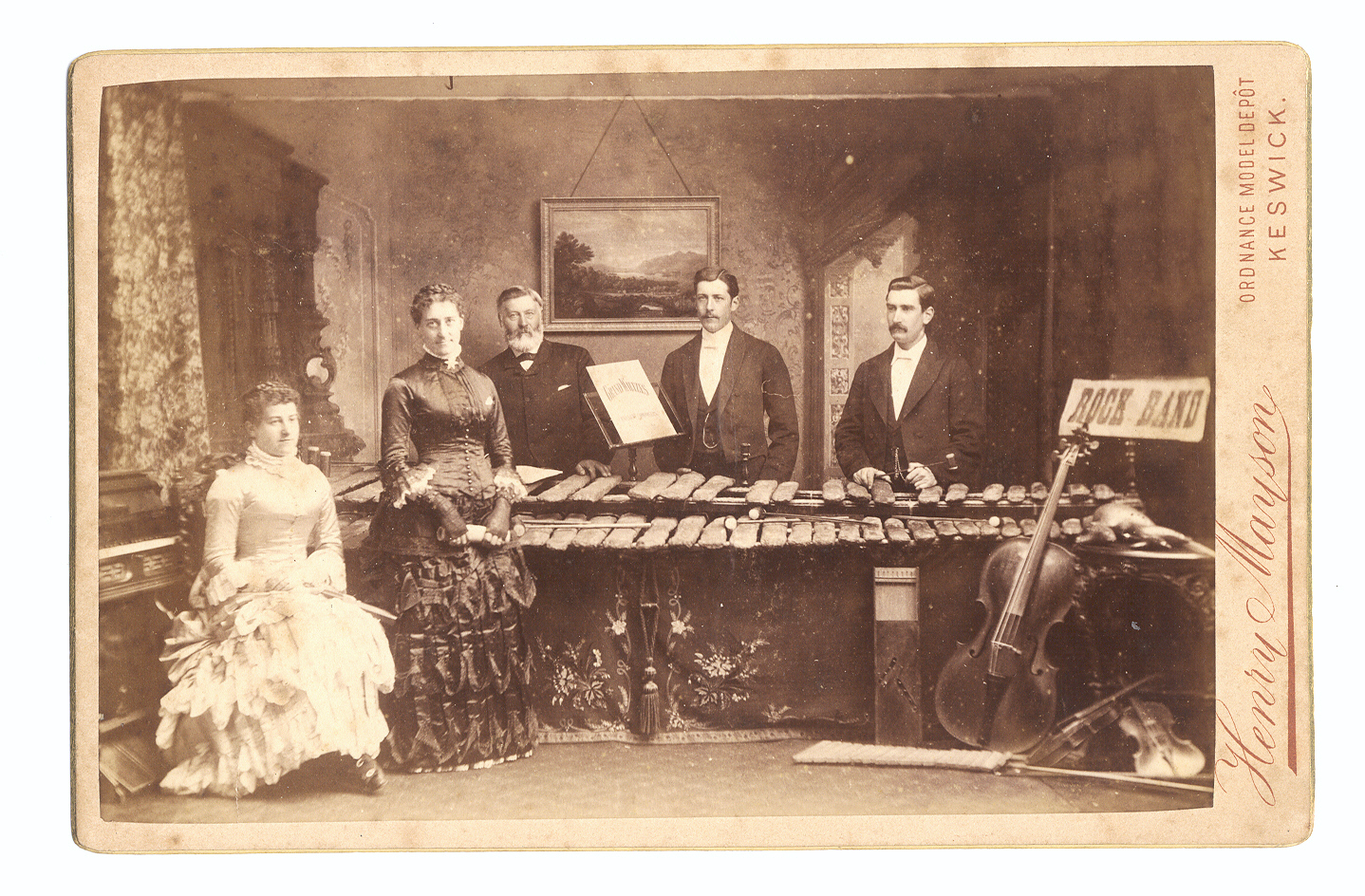The image shows the family in a grand parlor setting with a musical score that reads Grand Waltzes. The image is in very good condition with very nice tones and contrast. There are a few spots with some being in the original negative. By Henry Mayson, Keswick.