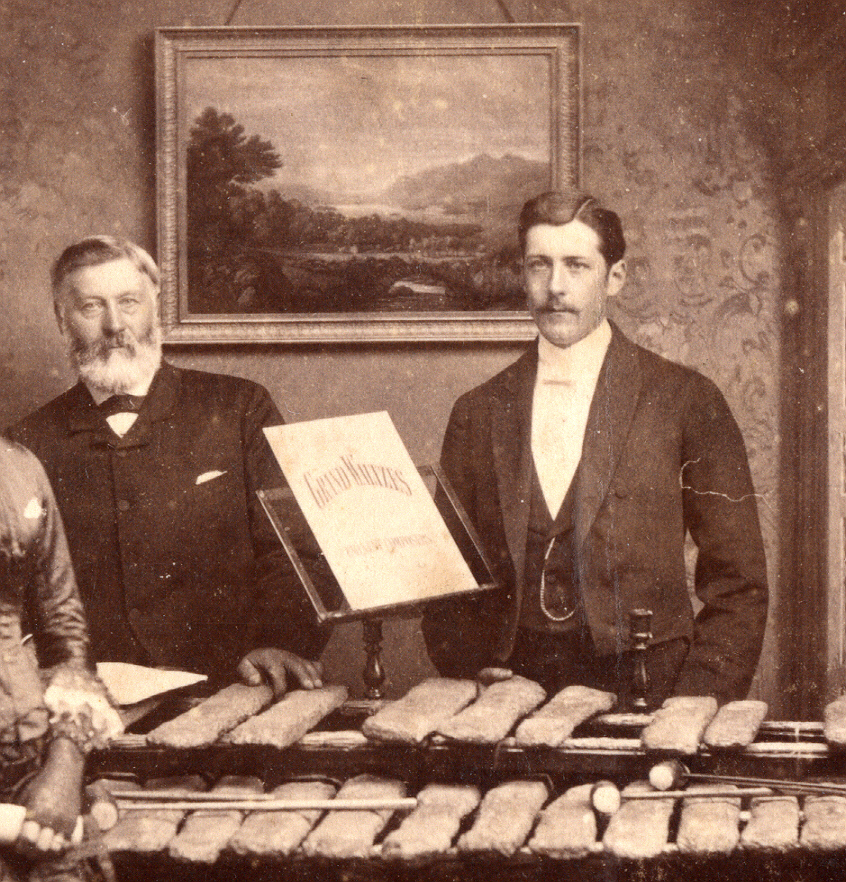 Hilarious cabinet card featuring the Till Family Rock Band with their lithophone, which is a musical instrument consisting of a rock or pieces of rock which are struck to produce musical notes. The Till family was a 19th-century musical group from England that performed in the 1880s using a “rock harmonicon” or stone xylophone. Of course they became known as the first “rock band!” They also featured string instruments, and one of their creative “swinging harps” is next to the cello and violins. A portable xylophone is also seen on the floor. In addition, on the far-left side we see a pump organ. They were also known for playing musical glasses.  The largest of their lithophones, which we see here, would weigh over a ton and half pounds! There is a fascinating article by Bradley Strauchen-Scherer about the family on the Metropolitan Art Museum’s website: https://www.metmuseum.org/perspectives/wild-sound.