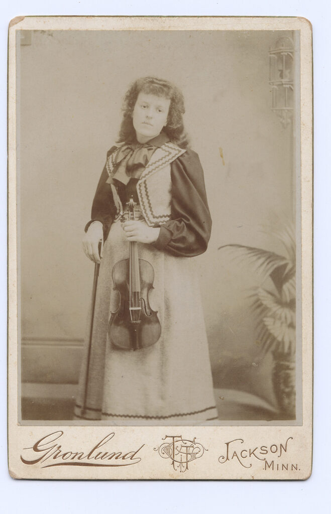 Wonderful cabinet card of a melancholy young woman holding her violin and bow. With her head tilted slightly to the side she seems lost in thought…perhaps of her next composition. She wears an interesting regional outfit and an unusual vest with pipping. The image is in very good condition with good tones ad contrast. There is some light wear and a little nick in the top layer of the mount on the top left side. By Gronlund, Jackson, MN.