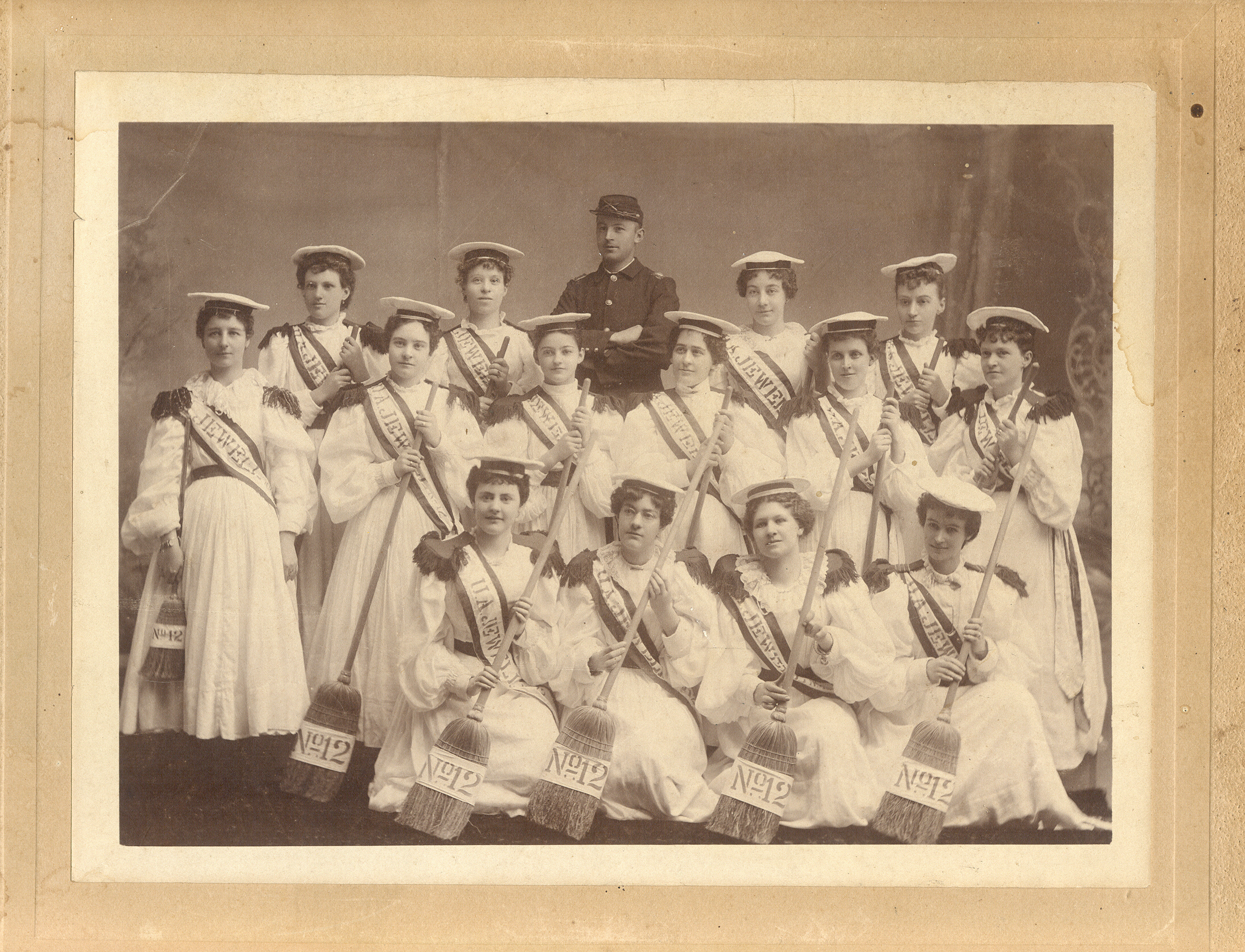 Outstanding large mounted warm toned photograph showing fourteen young women proudly posed holding brooms, with a smiling U.S. soldier standing in center back of the group. Wearing lovely white dresses with matching sailor style hats, they all wear a sash that reads U.A. Jewell No.12 which corresponds to the brooms. A bonus is that almost all of the women are smiling, which is rare for a large group during this period. We couldn’t find any information on U.A Jewell through a quick search but speculate that because of the soldier this was a company producing brooms and other materials for the military in the west. The image has beautiful rich tones and contrast. There is very light typical wear and one small stain on the left side border as seen. The mount has some wear and rounding to a couple of the corners. By Hyland, Portland, OR.