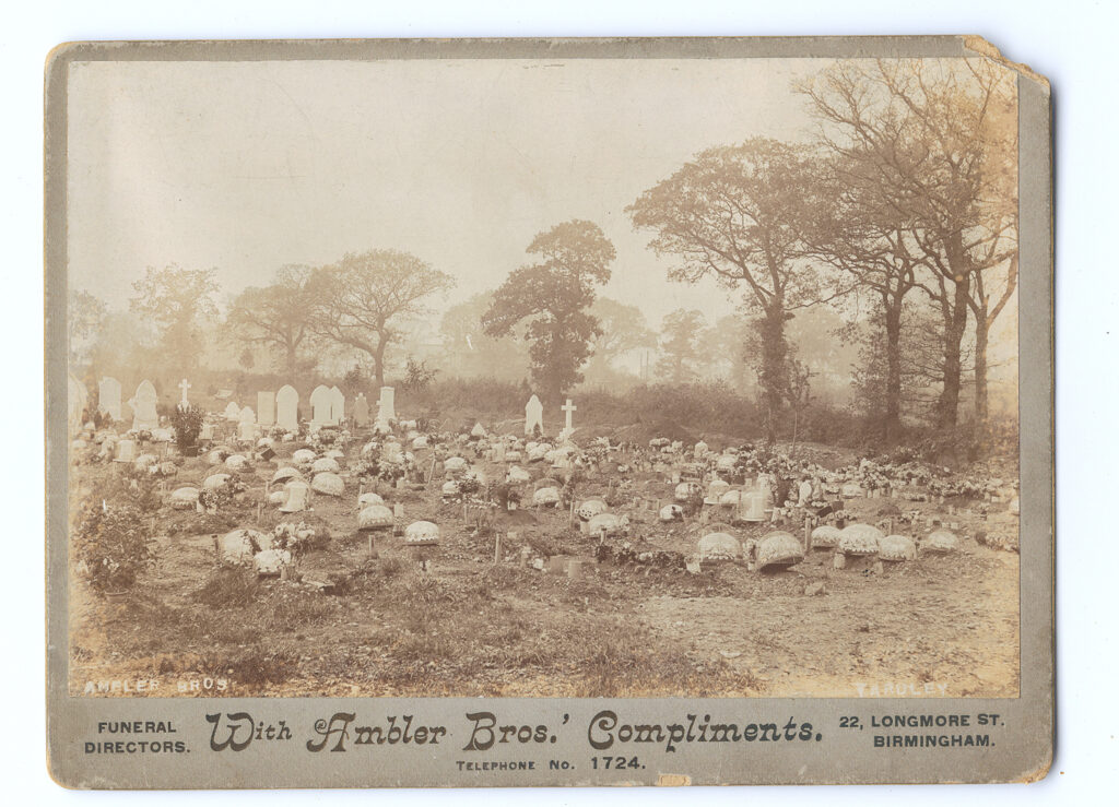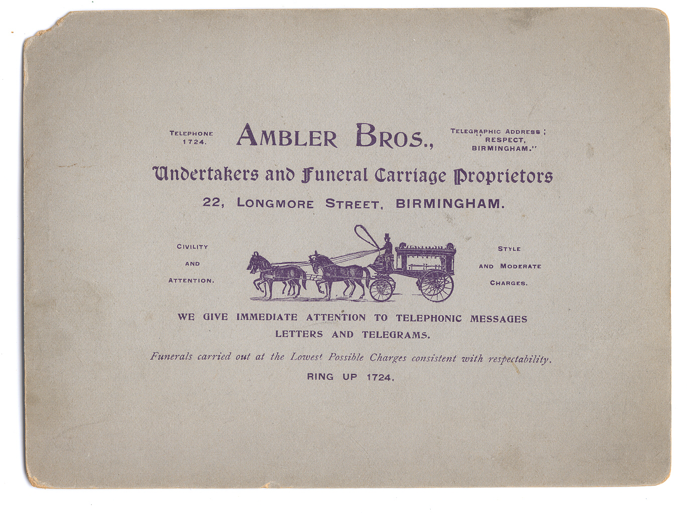 The back of the mount has a superior advertisement showing a funeral carriage being driven by a man and four horses. We see their telephone number at the top and it says “We Give Immediate Attention to Telephonic Messages Letters and Telegrams.” Their telegraphic address is “Respect, Birmingham.” It also reads “Funerals carried out at the Lowest Possible Charges consistent with respectability.”