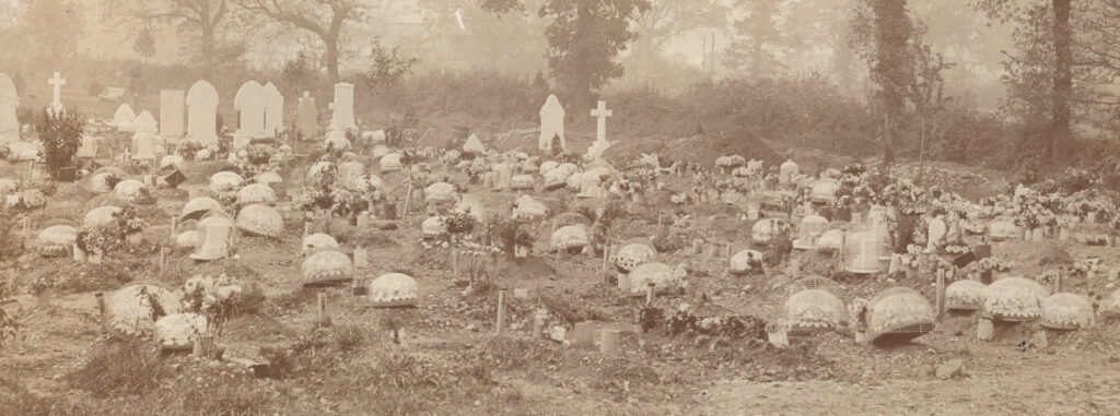 Incredible advertising cabinet card for Funeral Directors the Ambler Bros. This is one of the more unique advertising photographs we have offered. In it, we see an unusual cemetery scene of unmarked graves with caged or glass domes over floral arrangements. We have never seen anything similar in the past so if anyone has additional information it would be appreciated. Also, there are wooden stakes with just numbers identifying the plots. There are also a number of what we assume are drain pipes just above the ground. A large number of potted flowers are visible on the far right and some traditional headstones are seen in the background. It looks like a bleak fall or winter day with the fog just lifting, which adds an appropriately somber atmosphere. A solitary bench is seen in the far background for contemplation.