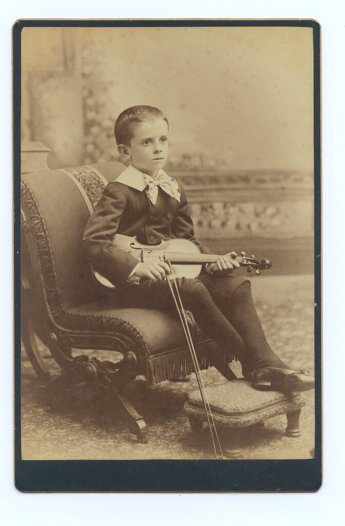 Heartwarming cabinet card of a young violinist in a lovely side profile, clutching his instrument and bow. This young man certainly seems serious about his music and we would not be surprised if he had a career as a well-known musician. The image is in very good plus condition with great tones and contrast. By Rodgers, Hartford, Conn.