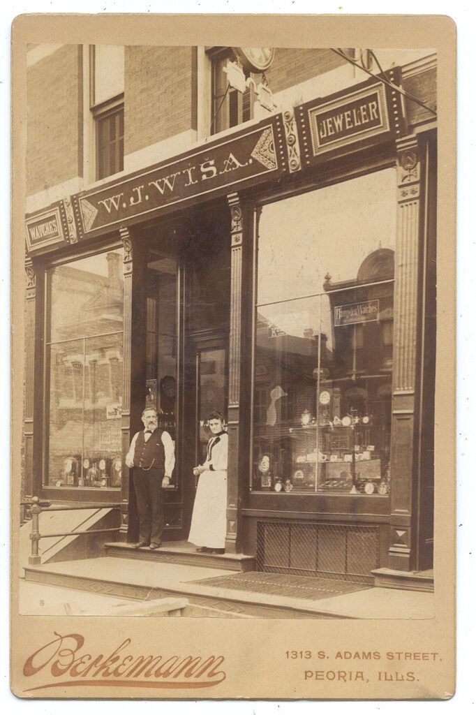 Splendid occupational cabinet card showing Illinois jeweler J. W. Wisa and his wife or employee outside his store. At the very top edge we see a portion of a large watch with eyeglass hanging from the bottom. The marquee up top advertise jeweler on the right side and watches on the left. The large showcase windows have a wonderful display of clocks which include elaborate glass dome versions, a carved wood clock, and figural examples along with a display of jewelry on the right side. There is also a sign inside advertising Hampden Watches. The image is in very good plus condition with great tones and contrast and some typical light wear seen at an angle. By Berkemann, Peoria, ILLS.
