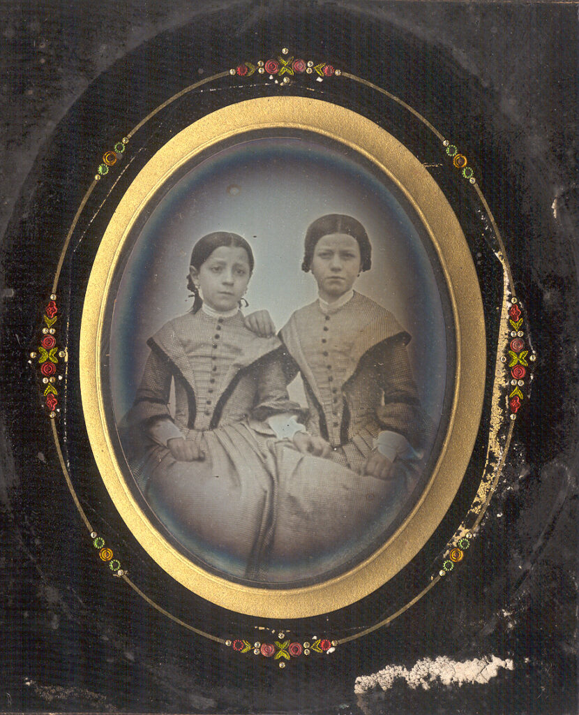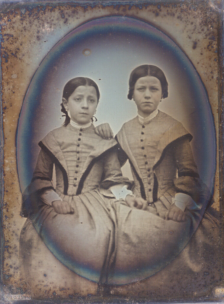 Treasured quarter-plate French daguerreotype of two sisters which are identified in period handwriting on the back. The older daughter on the right is Caroline aged 10 and we are having trouble deciphering the cursive writing with the other girls name but she is 7 years old. The portrait was done in 1856. This tender image captures the sisters in identical gorgeous checkered gowns with black highlights and buttons. Caroline places her hand on her sister’s shoulder as she appears quite apprehensive of the process. The young girls hand creeps towards her sister’s hand on her lap for additional support. The image is in excellent minus condition with very nice tones and contrast. It had old seals still attached on the back and the plate mark is Ninet. V OR 40. We assume this was from Alphonse Ninet who according to the Directory of Belgian photographers was a manufacturer and supplier of daguerreotype plates in Paris 1852-64. The paper where the identifications are located had been opened down the middle for a view inside at some point. We suspect someone was looking for additional information on the girls or the photographer. We cleaned the inside glass and have resealed the image. The passe-partout has beautiful jeweled glass highlights but it does have some loss as seen. It is housed in a plain black wood oval frame that has some wear. It has a large hook that extends off the back for hanging. $300