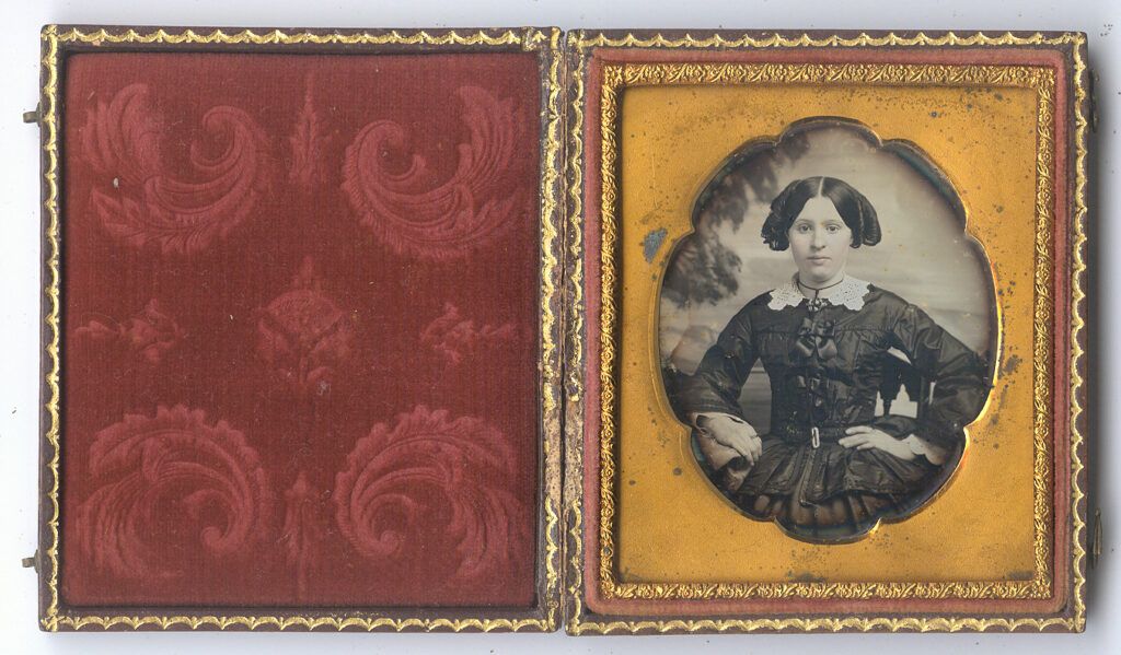Breathtaking sixth-plate daguerreotype of an attractive young woman displaying some serious attitude. We love her confidence as if to say, “I’m going to conquer the world and to damn with the norms!” Fashion forward with a gorgeous dress she poses with her hand on her hip and stares directly at the photographer. Her hair is up with cool curls which glisten in the light. A painted backdrop completes this piece. While this is not photographer identified it does remind us of a Willard, Philadelphia that we sold in the past. The plate has spectacular tones and contrast with a few small scattered spots. We have resealed it with a new glass and it resides in a full leather case. $200