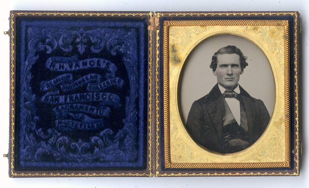 Extraordinary half-plate ambrotype of what appears to be at least a partially blind older gentleman. This sharp image has many layers from the one offset eye along with the fact that he appears to have no bottom lip. Of course this is an illusion as he has his mouth tightly closed but we do wonder if he even has any teeth still left! His hair and beard are perfectly groomed so it seems that there was someone in the house that helped him prepare for most likely his final portrait. This mesmerizing ambrotype is in excellent condition with fantastic tones and contrast. What might appear to be issues in the black at the bottom are actually tiny polka-dots on the lapels of his jacket that are a shade lighter than his suit. We replaced the cover glass and it is housed in a decorative oval wood frame that has loss and wear as seen. We have attached an archival paper backing to provide additional support. We did leave the original bent nail in the back that was used for hanging at one time. You won’t find a better ambrotype than this one! $280