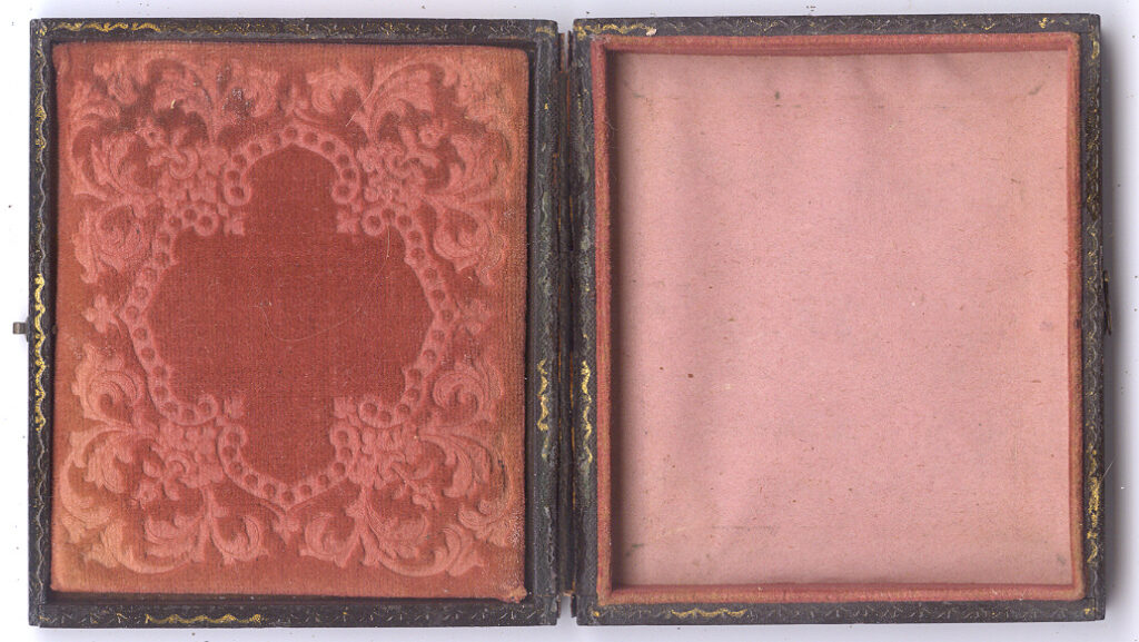 Cool empty sixth-plate decorative pressed paper hard shelled case. It has gold gilding scroll work on the outside with a raised medallion center with a different design. It is a heavy lacquer coating which creates that hard shell appearance and feel. The case is in wonderful condition with a small underlay of pneumatic leather on the spine. There is no image, brass mat or preserver so it is waiting for that special image. $25