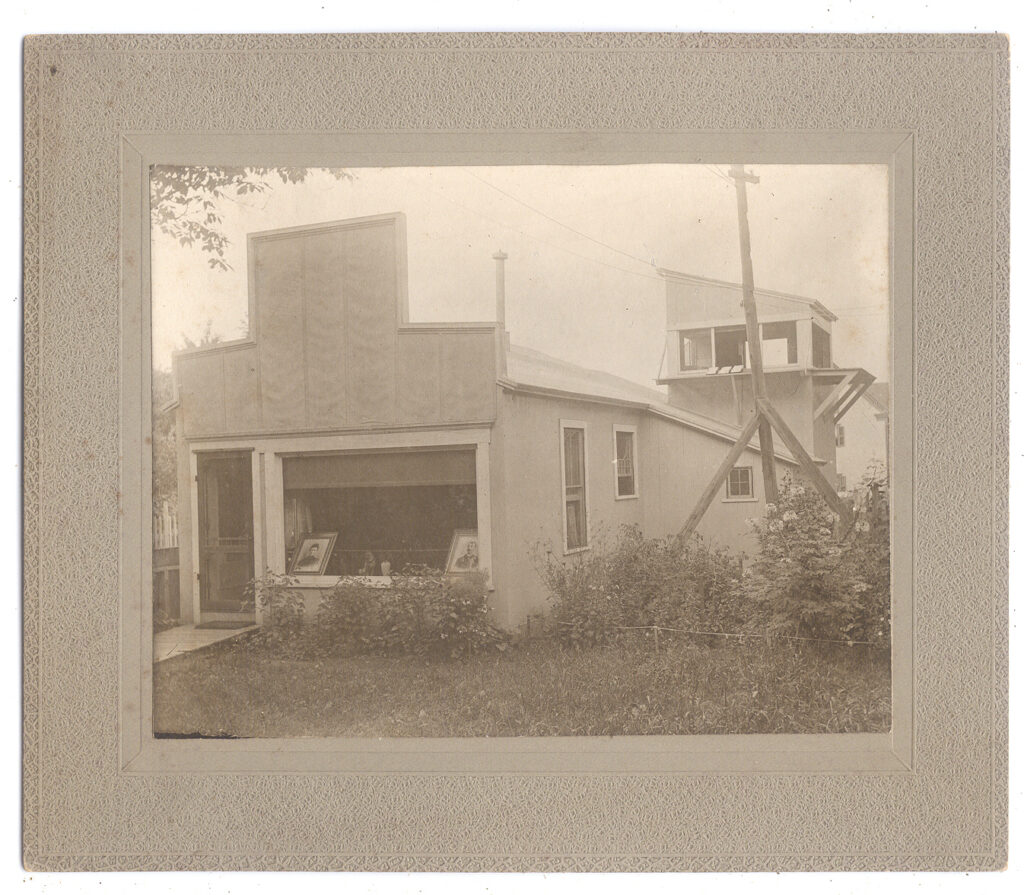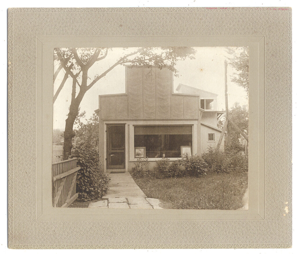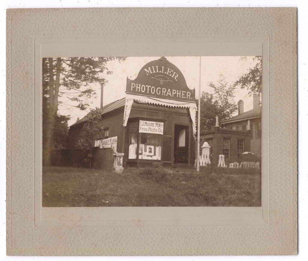 Splendid group of three cabinet cards, (5 ½” x 6 ½”), of Middletown, CT photographic studios. The first two show the same building from different angles. It has just been closed or about to open as we see two framed enlargements in the front window along with a vase and the photographer’s dog looking out the window. The view directly in front shows the best view of the dog which appears to be a bulldog. The third image shows the studio for F. J. Moore MN’G Prov. Photo. Co. This was previously owned by William Miller who had studios around this area. We’re not sure if they were in partnership at this time or if Moore was documenting the history of the transfer of the studio. We love the fact that it’s next to a small cemetery or possibly a funeral home/stone maker. The former owner had numerous images from the Moore archive and we suspect Moore moved from the previous location to Miller’s old studio. We’ve seen a number of photos of the town and the empty building has that cool open elevated view that would have been perfect for capturing those images. The images are in very good condition with outstanding tones and contrast on the finished studio. There are a few spots as seen. For another example of Moore’s marked work please see the following lot of two dolls. $110