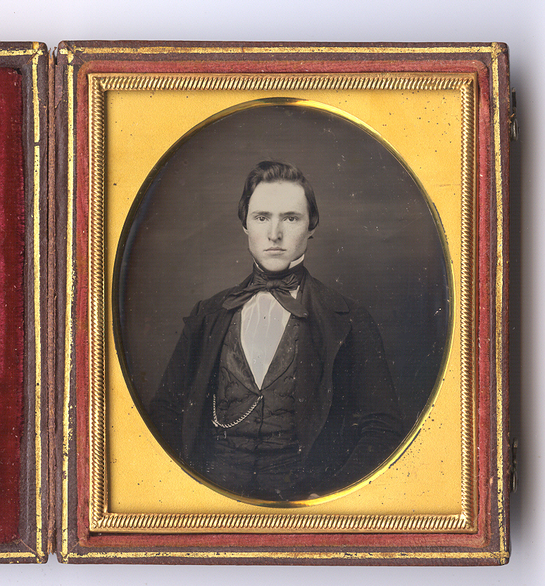 Enthralling sixth-plate daguerreotype of a devilishly handsome young man. Slender and tall he has an intense yet attractive appearance. While his outfit is understated his vest is quite unique in its quilted style. His hair while perfectly styled seems to have some static at the top as wisps of strands extend upwards. While he is posed in front of a plain backdrop in person it reads slightly like a sky in the background. The sharp plate is in excellent minus condition with strong tones and contrast and some light tinting to his face and lips. There are a few tiny spots as seen. The image had old seals intact and we have resealed it with a new glass. It is housed in a full leather case. $75.00