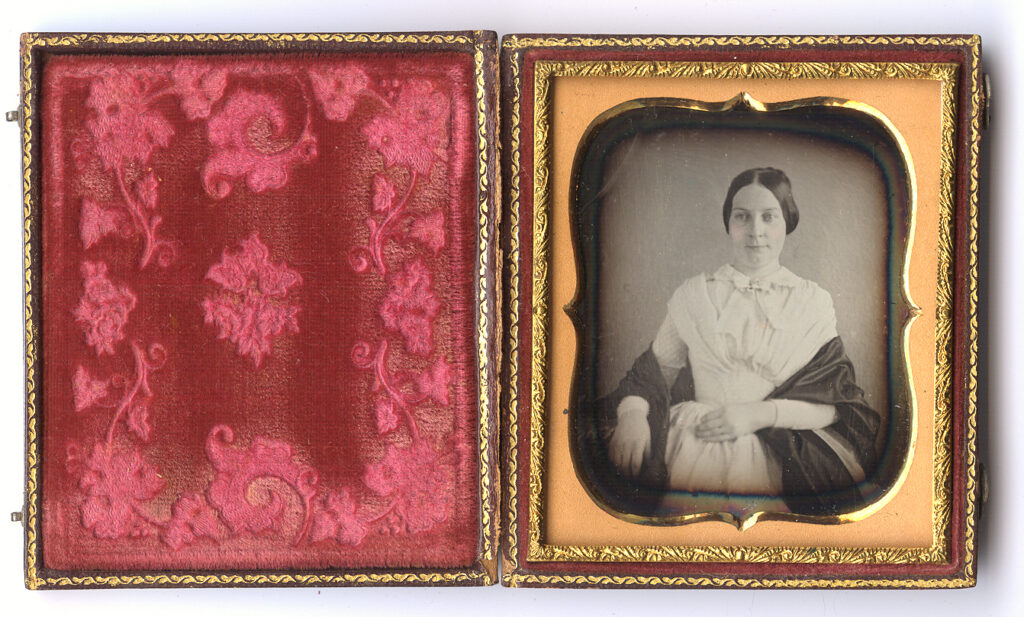 Charming sixth-plate daguerreotype of a woman dressed in white with a black silk drape wrapped around her arms. We don’t often see a pure white dress and it stands in perfect contrast to her lovely dark cape. The image is in very good condition with a hint of tint to her face and lips. The plate had old seals but we see a couple of thin black lines on the right side which was probably done during the process. There are also some light buffing lines seen mostly at an angle. We have resealed the image with a new glass and it is housed in a full case. $60