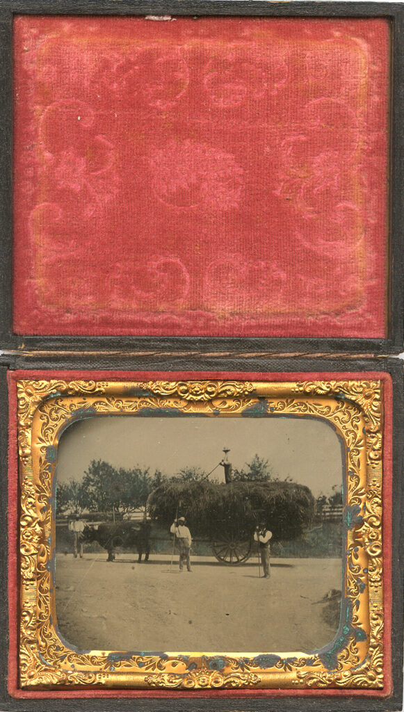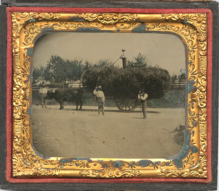 Superb sixth-plate outdoor occupational ambrotype of four farmers moving an extremely large wagon stacked high with hay. One man stands steadily atop this large mound skillfully arranging the hay with his rake to achieve the maximum load. We have to say a fall from this height would certainly not be pleasant! Two other men stand in front of the crop with rakes in hand. Another man stands to the far left steading the large black oxen that is pulling the wagon. It is difficult to tell because of the shadows but this man could be African American. While not definitive we speculate a traveling photographer happened on to this ordinary workday and either sold them an image or captured rural farming life for a display of his talents in his traveling studio. In either scenario a fantastic outdoor working occupational that is not often seen. The image is in very good condition with nice tones and contrast. There is also some greenish tinting to the trees and ground as seen. There is one extremely light line mostly noticed only at an angle in the area of the oxen and this might be original to the collodion. The image is housed in a full case. $650