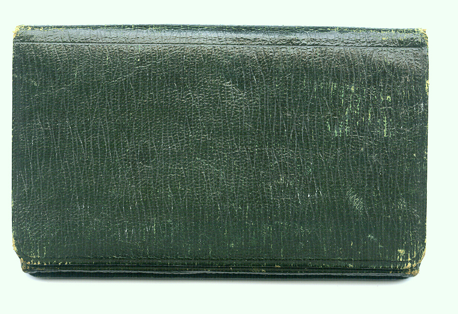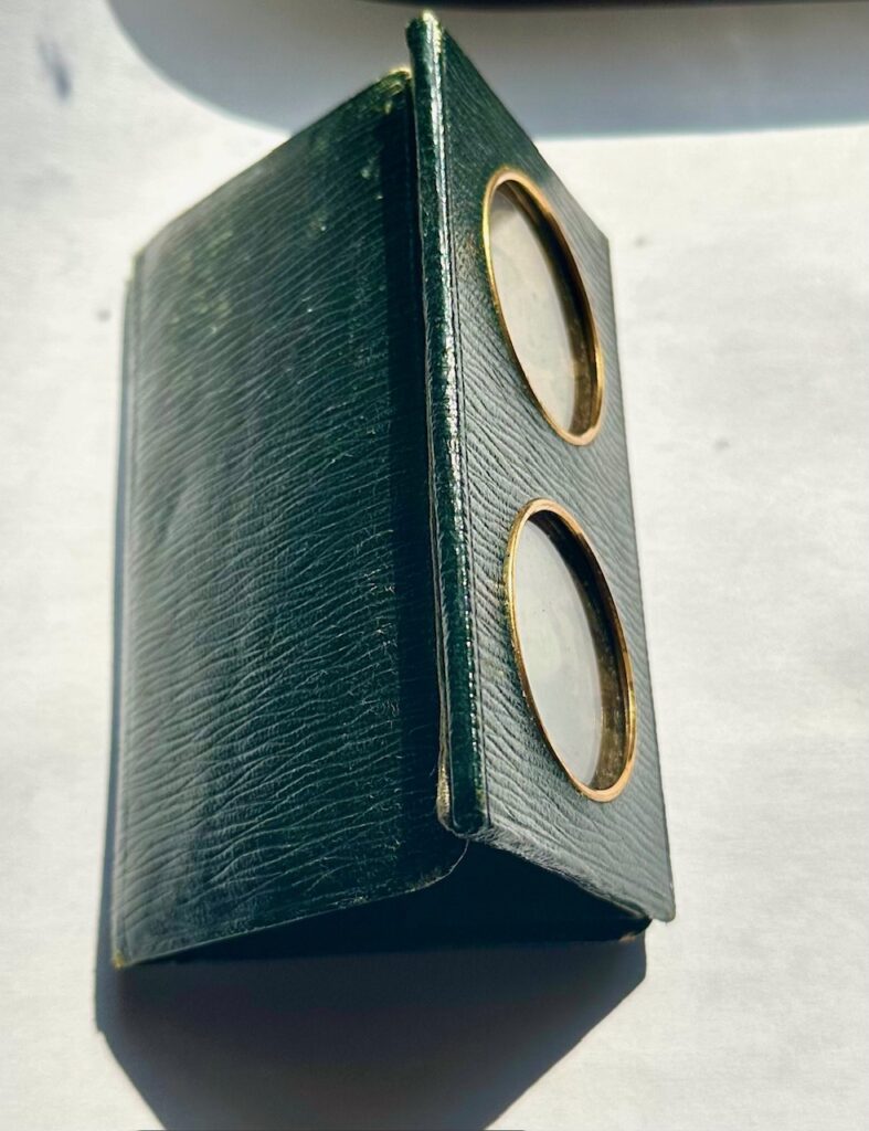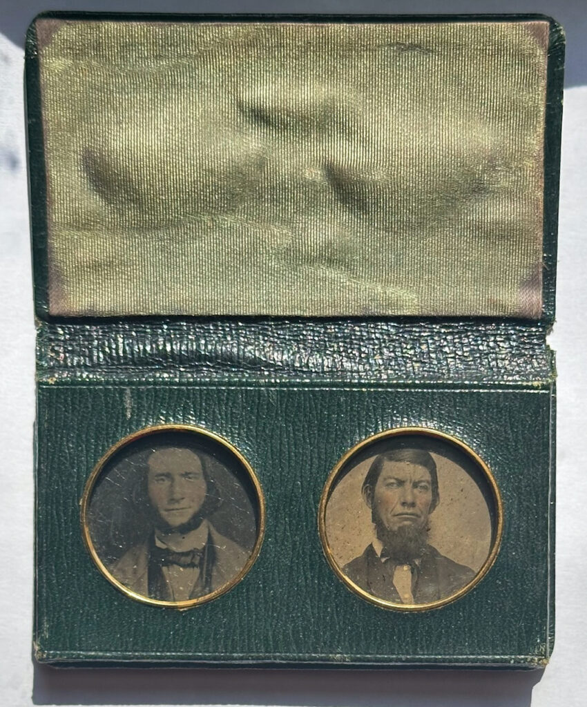 Dazzling green leather fold-out book style case that holds two small circular tintypes. It reminds us of the small notebooks, diaries or even calendars of the day. We assume the men are brothers but it is possible this is a father and son. Both men have serious impressions on their faces but the guy on the right is certainly more intimidating. We wouldn’t want to get on his bad side! His image is also more vibrant while his relative has some typical light crackling in the top varnish. This is a unique piece in a rare green color that will display beautifully on a shelf or mantelpiece.