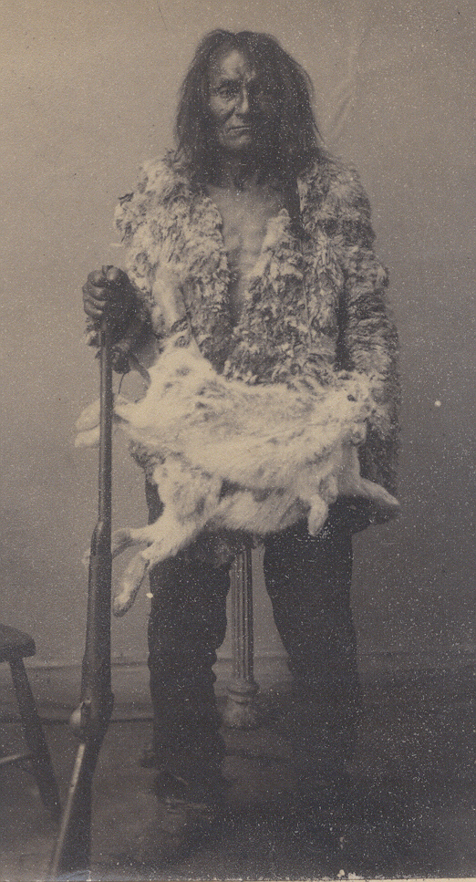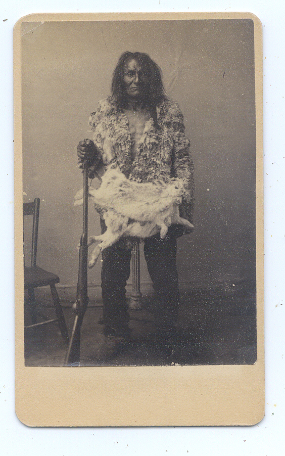 Extraordinary cdv of a First Nations hunter and/or trapper holding his rifle and his prized snowshoe hare pelts. His fur shirt is incredible and the detail in his face shows a long outdoor life. According to the Canadian Encyclopedia, “ Wauzhushk Onigum Nation (pronounced Waa-JUSHK oh-KNEE-gum), commonly referred to as Rat Portage, is an Anishinaabe community based on the north shore of Lake of the Woods in northwestern Ontario. Both Kenora and Wauzhushk Onigum’s reserve were originally called Rat Portage because roughly translated Wauzhushk Onigum means “portage to the country of the muskrats.” In 1886, the Government of Canada seized Wauzhushk Onigum’s Sultana Island under the guise of benefiting the First Nation. Sultana Island is located in the Lake of the Woods, and at the time was part of Wauzhushk Onigum’s reserve lands. Five years earlier, in 1881, prospectors had discovered gold on the island. According to oral history of Treaty 3 negotiations, Lieutenant-Governor Alexander Morris promised First Nations monetary benefits from mineral deposits on reserve. This promise was broken. During its operation between 1891 and 1906, the Sultana gold mine was the leading gold producer in Ontario. Wauzhushk Onigum, however, did not benefit from it. The First Nation eventually settled this grievance through a specific claim.” The First Nation next generation continued to be abused in the Catholic schools with many dying. “In the summer of 1974, the Ojibway Warrior Society occupied Anicinabe Park, located just south of Kenora and on traditional territory. The occupation was in direct response to the way First Nations people were being treated in Canada. One focal point was the mercury contamination at Grassy Narrows, but people gathered for other reasons, too. Their demands included improved living conditions for First Nations people, such as access to housing and education. The occupation lasted six weeks, from mid-July to late August. While the protest ended peacefully, it exposed the deep-seated racism that prevailed in Northwestern Ontario.” The cdv is in excellent minus condition with strong tones and nice contrast and a little wear as seen. By J.K. Salter, Rat Portage, Keewatin. Salter’s Native American images aren’t often available so buy this one while you can! $250